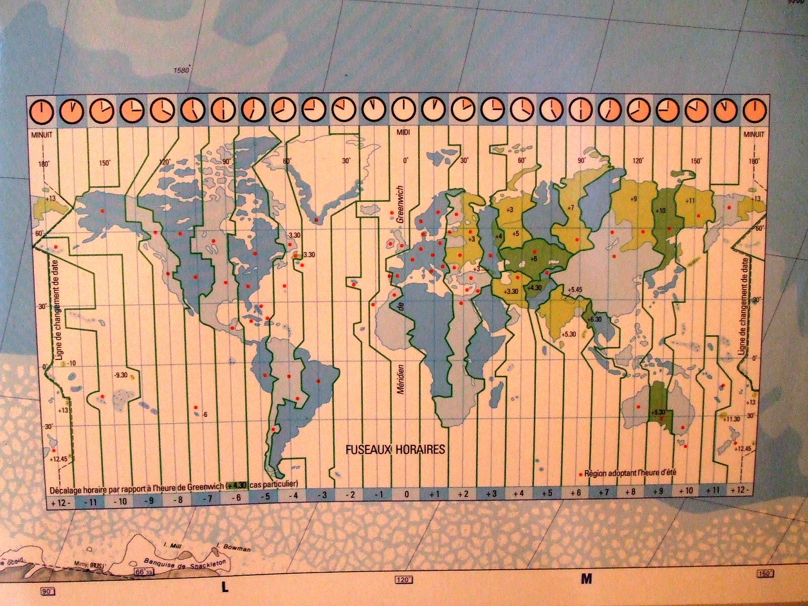 Je reproduis la carte des fuseaux horaires légaux, qui figure sur une mappemonde : ils sont très « tordus » pour tenir compte des frontières des pays. Cette carte permet de connaître l’heure légale partout dans le monde.